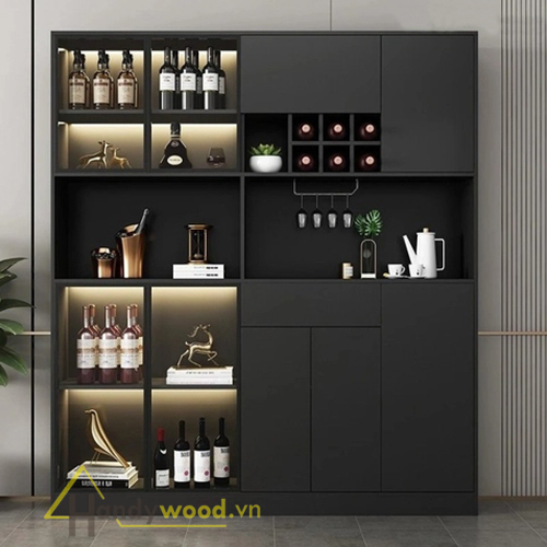 Tủ bao gồm các khoang trưng bày mở, ngăn kín lưu trữ đồ, và kệ treo ly rượu — tạo nên một tổ hợp lưu trữ thông minh: