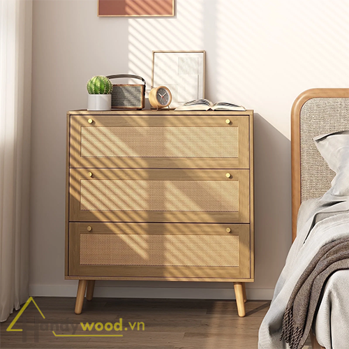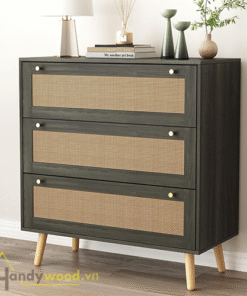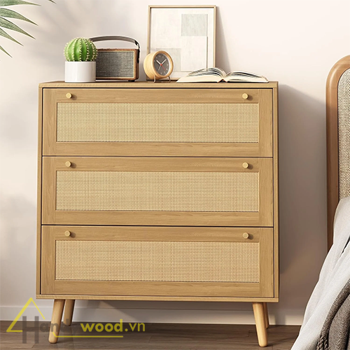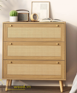 Sản phẩm sử dụng gỗ công nghiệp MDF chống ẩm phủ veneer tự nhiên, kết hợp mặt cánh ngăn kéo bằng mây tre đan. Đây là sự kết hợp hoàn hảo giữa sự bền chắc và vẻ đẹp thanh lịch, tạo nên nét riêng biệt cho không gian.